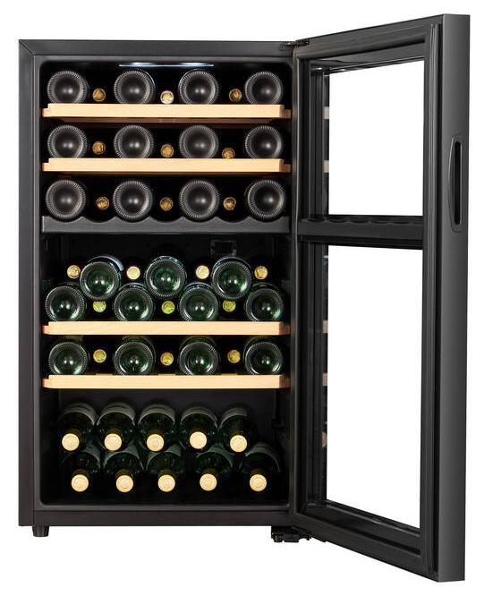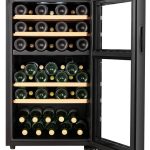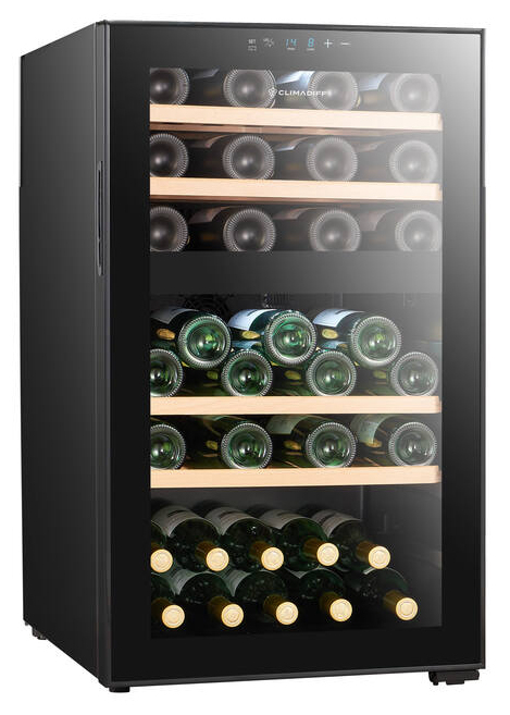 Climadiff CEPAGE52DZF. Posizionamento dell’apparecchio: Libera installazione, Colore struttura: Nero, Colore interno: Nero. Capacità bottiglie: 52 bottiglia/bottiglie, Tipo di prodotto: Cantinetta vino con compressore, Intervallo temperatura (zona 1): 5 – 20 °C. Colore dell’illuminazione interna: Bianco, Tipo di controllo: Touch, Lunghezza cavo: 2 m. Classe efficienza energetica: F, Consumo energetico annuo: 105 kWh, Scala di efficienza energetica: Da A a G. Larghezza: 495 mm, Profondità: 596 mm, Altezza: 835 mm