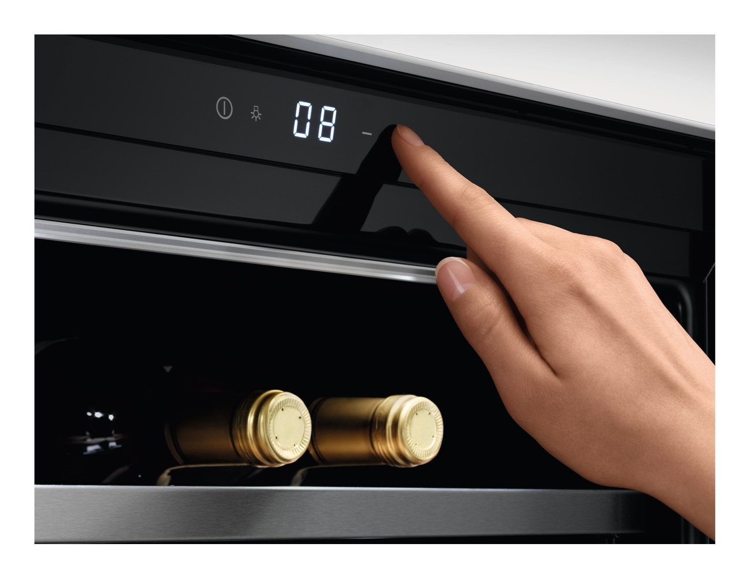 AEG KWK884520M Cantinetta Vino 45.5 cm. Posizionamento dell’apparecchio: Da incasso, Colore struttura: Nero, Acciaio inox, Colore interno: Acciaio inox. Capacità bottiglie: 18 bottiglia/bottiglie, Tipo di prodotto: Cantinetta vino con compressore, Intervallo temperatura (zona 1): 5 – 20 °C. Tipo di controllo: Touch, Lunghezza cavo: 1,8 m, Tipo di lampada: LED. Classe efficienza energetica: F, Consumo energetico annuo: 100 kWh, Scala di efficienza energetica: Da A a G. Larghezza: 596 mm, Profondità: 581 mm, Altezza: 456 mm