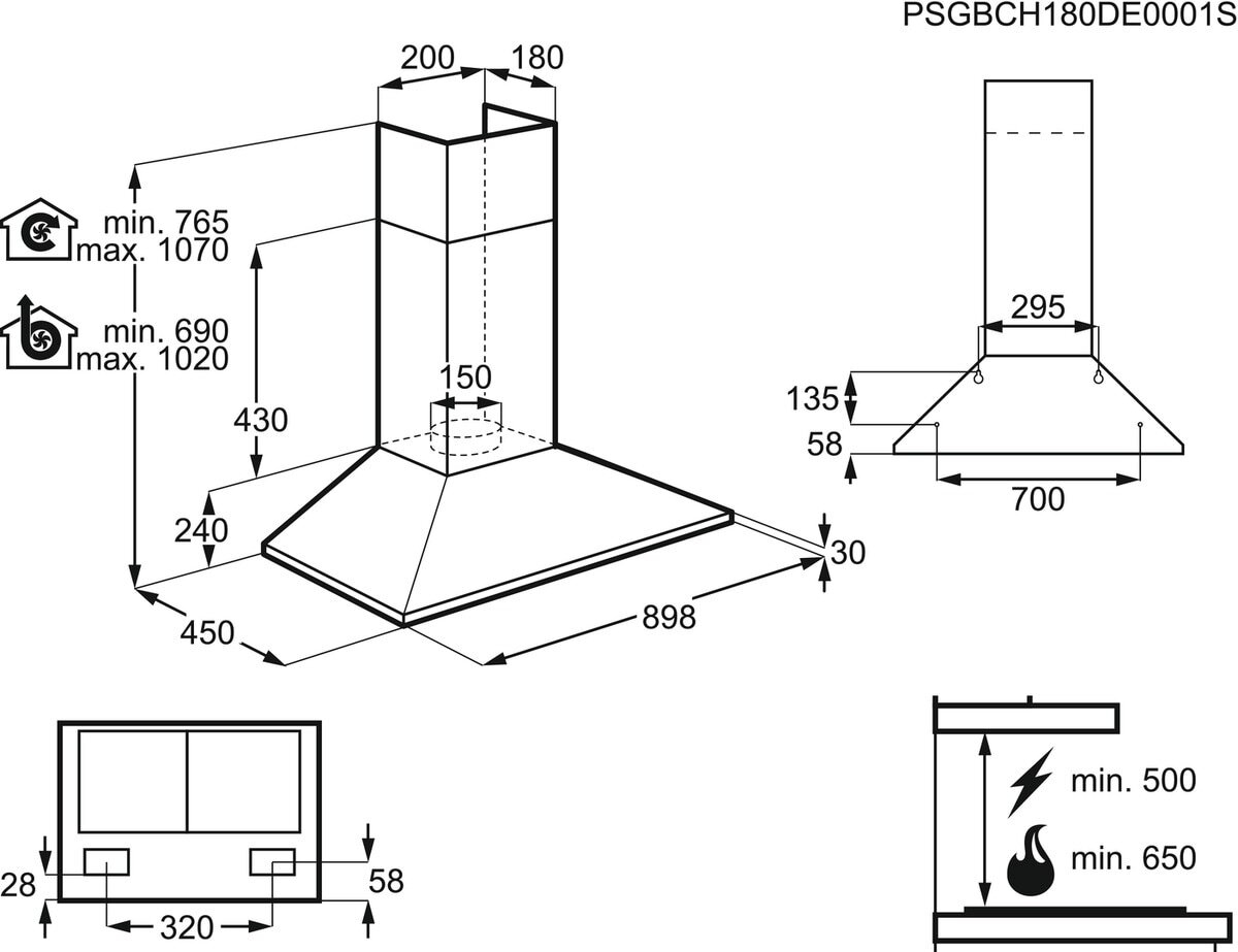Electrolux CAPPA CAMINO PIRAMIDE CLASSE D 90 cm LFC319X MADE IN EUROPE. Potenza massima di estrazione: 420 m³/h, Tipo di estrazione: Aspirante/Filtrante, Classe di efficienza dinamica del fluido: E. Tipo: Cappa aspirante a parete, Colore del prodotto: Acciaio inox, Tipo di controllo: Pulsanti. Tipo di filtro antigrasso: Metallo, Numero di filtri: 3 pz. Potenza lampadina: 4 W, Numero di lampadine: 2 lampadina(e), Tipo di Lampadina: LED. Classe efficienza energetica: D, Consumo energetico annuo: 72,8 kWh, Potenza motore: 120 W