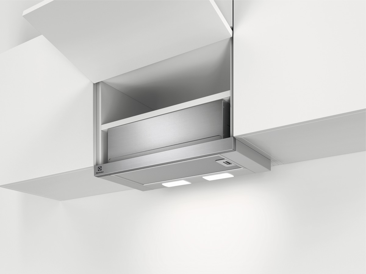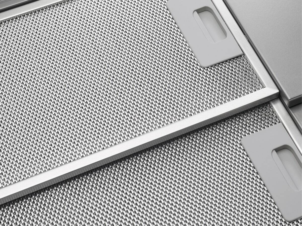 Electrolux LFP326S Cappa serie 300 LedLights 60 cm. Potenza massima di estrazione: 410 m³/h, Tipo di estrazione: Filtrante, Classe di efficienza dinamica del fluido: D. Tipo: Semintegrato (semincassato), Colore del prodotto: Grigio, Acciaio inox, Tipo di controllo: Tiro a effetto. Tipo di filtro antigrasso: Alluminio, Numero di filtri: 2 pz. Numero di lampadine: 2 lampadina(e), Tipo di Lampadina: LED, Temperatura colore: 3000 K. Classe efficienza energetica: C, Consumo energetico annuo: 56,6 kWh, Potenza motore: 100 W