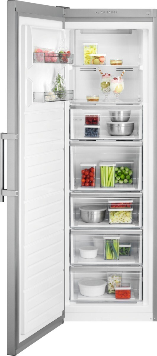 AEG Series 6000 FRIGORIFERO ARMADIO CONGELATORE NO FROST CLASSE D OAG7M281DX. Capacità netta congelatore: 278 L, Classe climatica: SN-T, Capacità di congelamento: 13 kg/24h, Autonomia senza energia elettrica: 15 h, Emissione acustica: 38 dB, Punteggio: 4*, Sistema No-frost. Cerniera porta: Sinistra. Tipo di lampada: LED. Classe efficienza energetica: D, Consumo energetico annuo: 198 kWh. Colore del prodotto: Acciaio inox