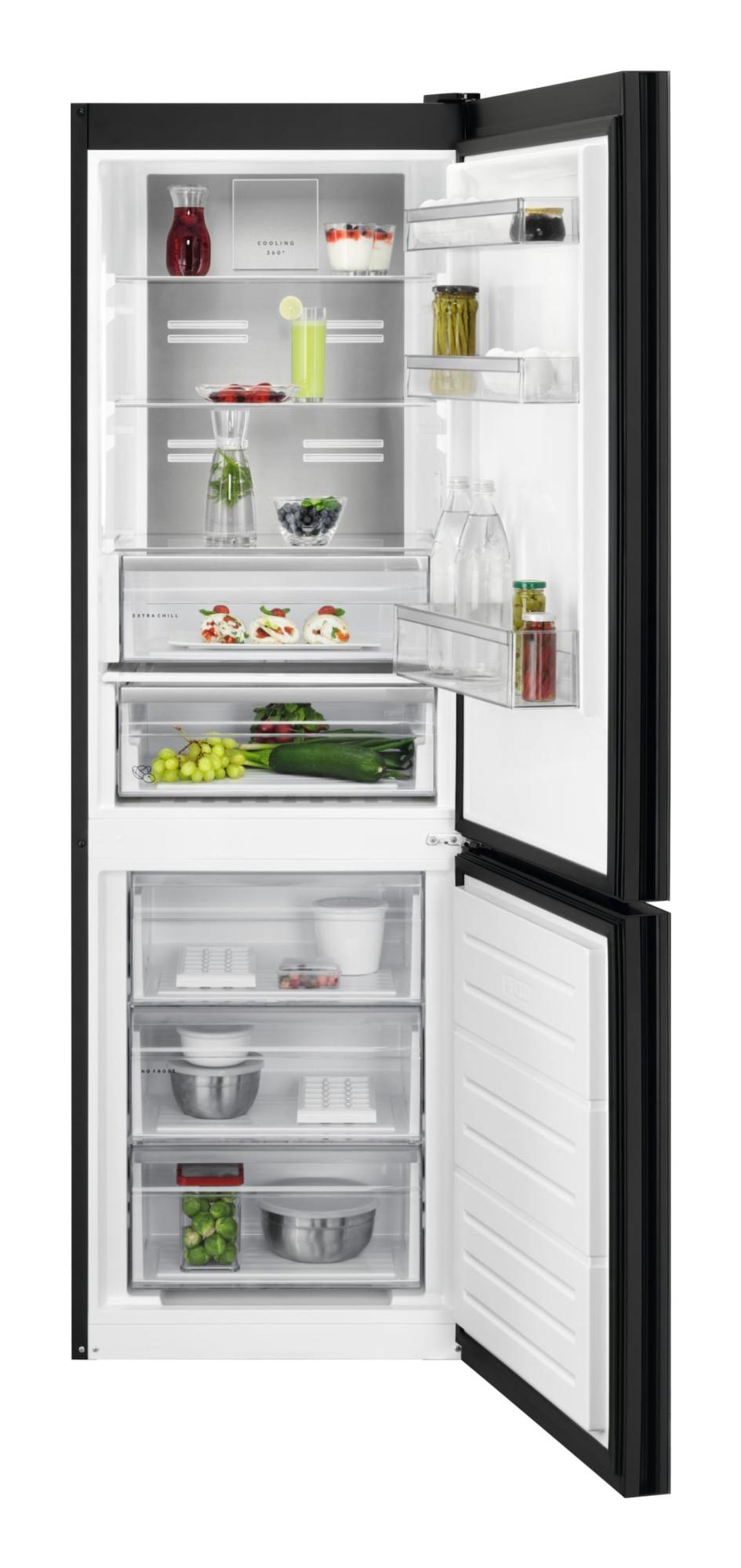 AEG ORC8M321ET Frigocongelatore Serie 8000 Cooling 360° 186 cm. Capacità netta totale: 330 L. Cerniera porta: Destra. Classe climatica: SN-T, Emissione acustica: 38 dB. Capacità netta frigorifero: 230 L, No Frost (frigorifero), Luce interna, Numero di ripiani frigorifero: 3, Numero di cassetti per verdura: 1. Capacità netta congelatore: 101 L, Capacità di congelamento: 8 kg/24h, No Frost (congelatore). Classe efficienza energetica: E, Consumo energetico annuo: 250 kWh. Colore del prodotto: Nero
