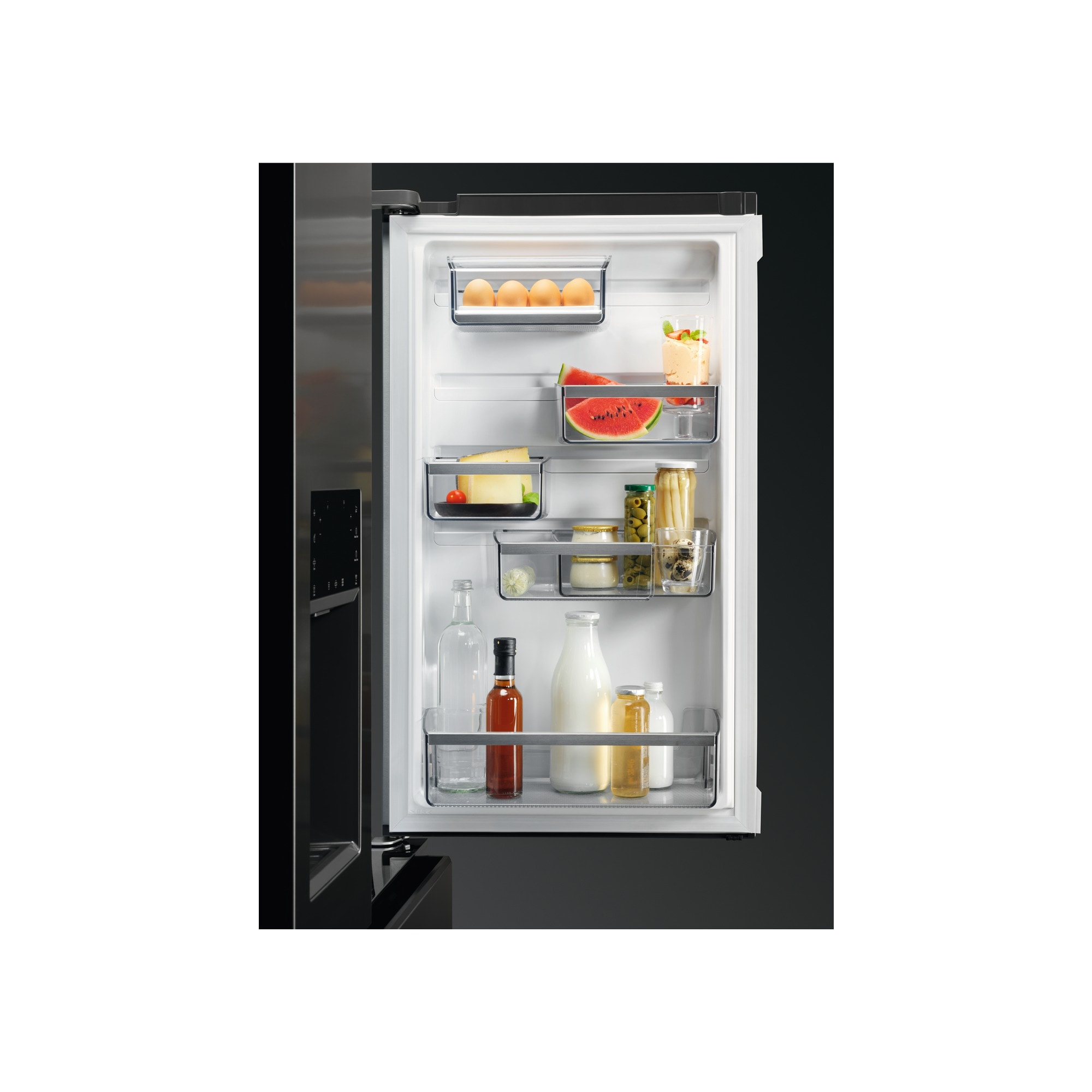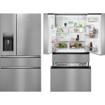 AEG RMB954E9VX Frigocongelatore Serie 9000 MultiSwitch 178.1 cm. Posizionamento dell’apparecchio: Libera installazione, Design del prodotto: Porta francese, Colore del prodotto: Argento, Acciaio inox. Capacità netta totale: 617 L, Classe climatica: SN-ST, Classe emissione rumore: C. Capacità netta frigorifero: 378 L, Tipo di lampada: LED. Capacità netta congelatore: 239 L, Posizione del congelatore: Posto in basso, Capacità di congelamento: 4,2 kg/24h. Lunghezza cavo: 2,5 m