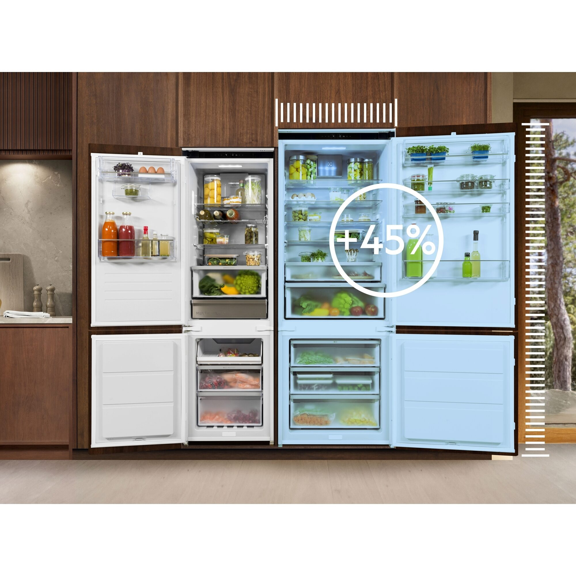 I frigoriferi EcoLinesono i nostri modelli con la massima efficienza energetica. Vantano interni di plastica riciclata e l’Ecometer, una guida nel definire impostazioni più efficienti: meno energia e meno sprechi alimentari.[5]