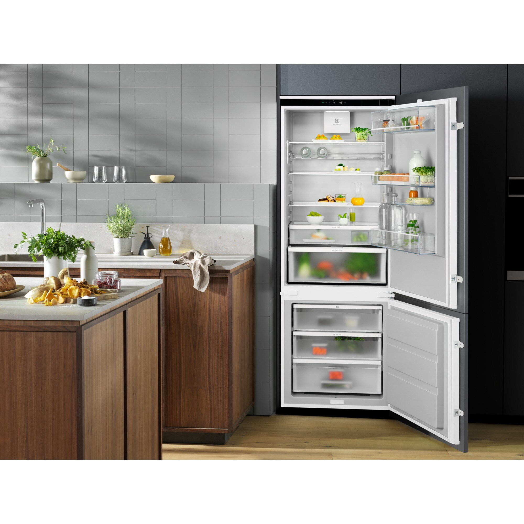 Electrolux KNR7TE75S Frigocongelatore Serie 700 GreenZone 710/696 188,4 cm. Capacità netta totale: 376 L. Cerniera porta: Destra. Classe climatica: SN-ST, Emissione acustica: 35 dB. Capacità netta frigorifero: 287 L, No Frost (frigorifero), Luce interna, Numero di ripiani frigorifero: 4. Capacità netta congelatore: 89 L, Capacità di congelamento: 10,5 kg/24h, No Frost (congelatore). Compartimento zona fresca. Classe efficienza energetica: E, Consumo energetico annuo: 247 kWh. Colore del prodotto: Bianco