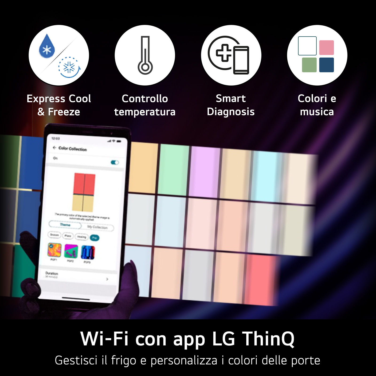 Collega il frigorifero al Wi-Fi e scarica l’app LG ThinQ sul tuo smartphone iOS o Android per avere a portata di mano tante funzioni. Ad esempio, puoi impostare musica, colori e modalità, personalizzando completamente il tuo MoodUP. Inoltre, puoi impostare le temperature, attivare il raffreddamento rapido quando stai tornando dal fare la spesa e monitorare i consumi direttamente dal tuo smartphone.