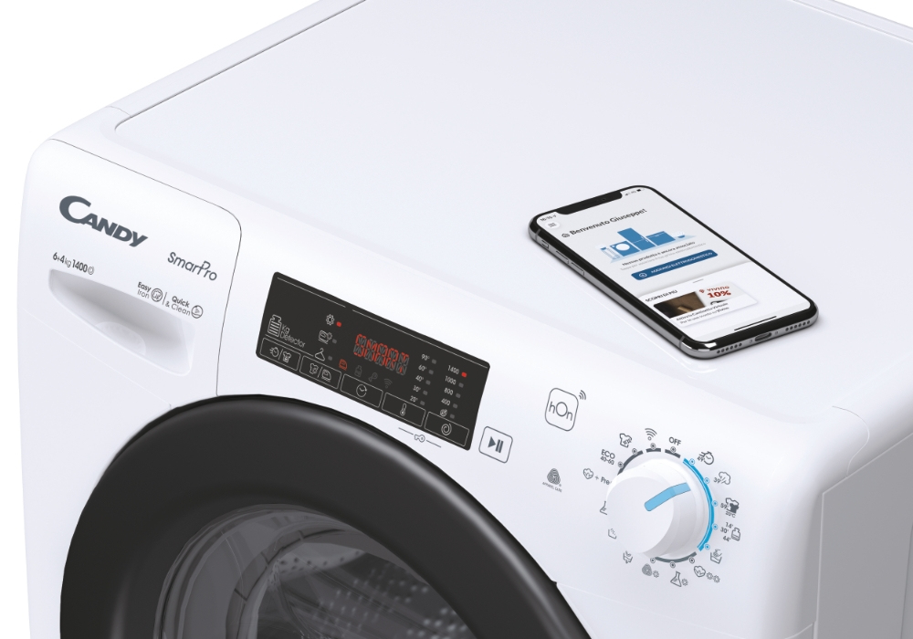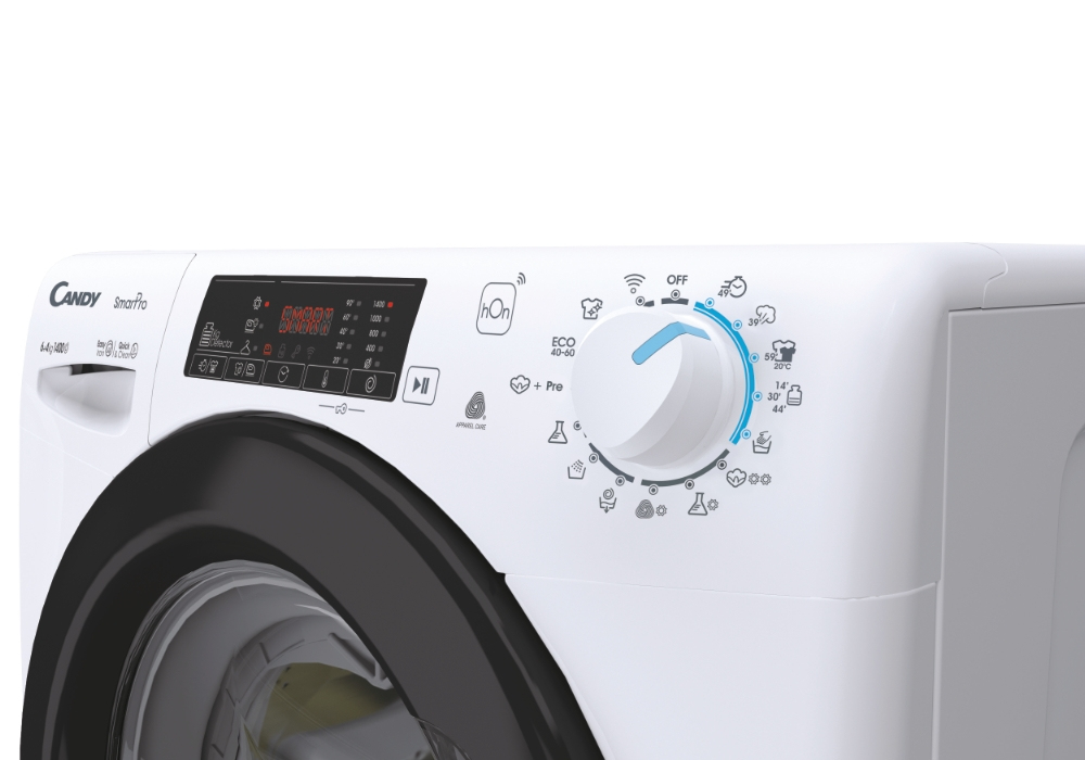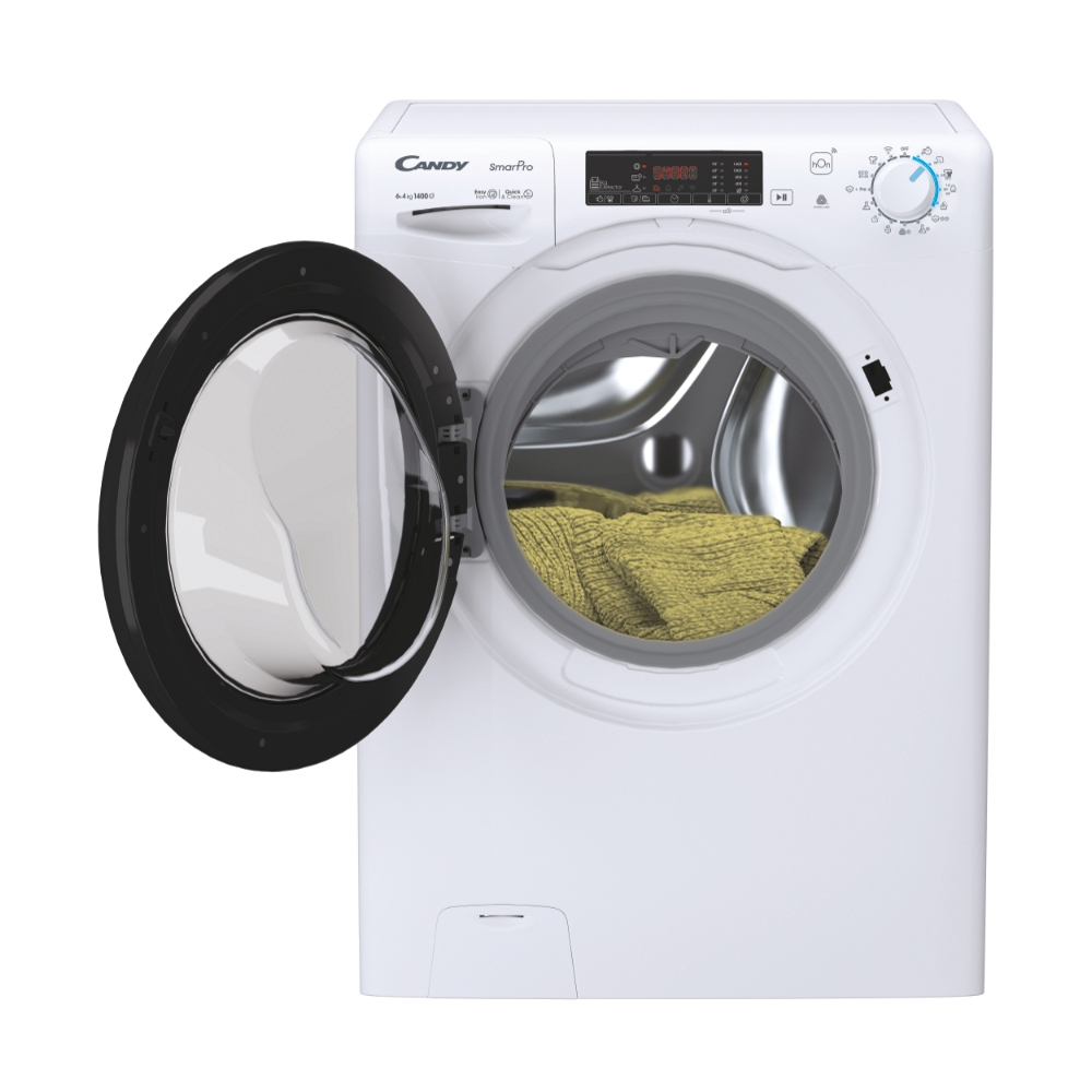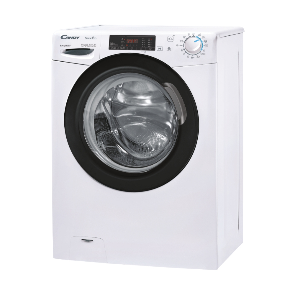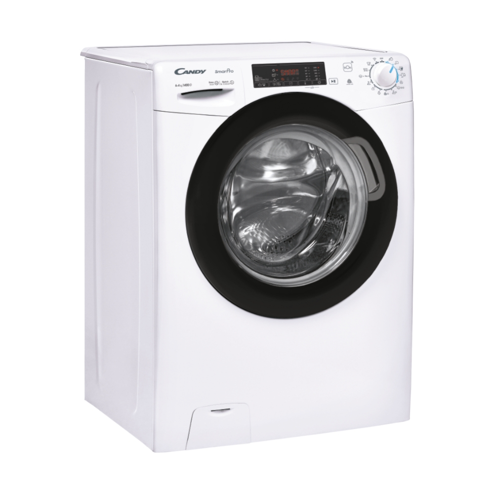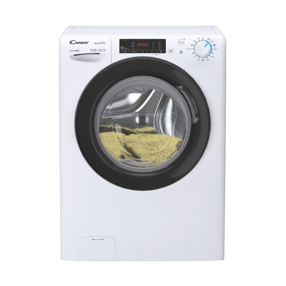 Candy Smart Pro CSHW4645TWB3/1-S. Tipo di carica: Caricamento frontale, Posizionamento dell’apparecchio: Libera installazione, Colore del prodotto: Bianco. Capacità di asciugatura: 4 kg, Velocità di centrifuga massima: 1400 Giri/min, Classe di efficienza della centrifuga: B. Classe di efficienza energetica (lavaggio): C, Classe di efficienza energetica( lavaggio e asciugatura): E, Consumo di acqua (lavaggio): 40 L. Tecnologie Candy (cura dei vestiti): Active Motion, Rivelatore KG, Mix Power System, Steam cycle. Profondità: 450 mm, Larghezza: 600 mm, Altezza: 850 mm