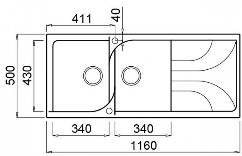 Elleci Ego 500. Tipo di lavello: Lavello montato su piano, Forma del lavandino: Rettangolare, Materiale del lavandino: Granitek. Larghezza: 1160 mm, Profondità: 500 mm, Larghezza del compartimento: 114 cm. Paese di origine: ItaliaLavello 2 vasche con gocciolatoio2x 34x43cm, Granitek, G48 Cemento