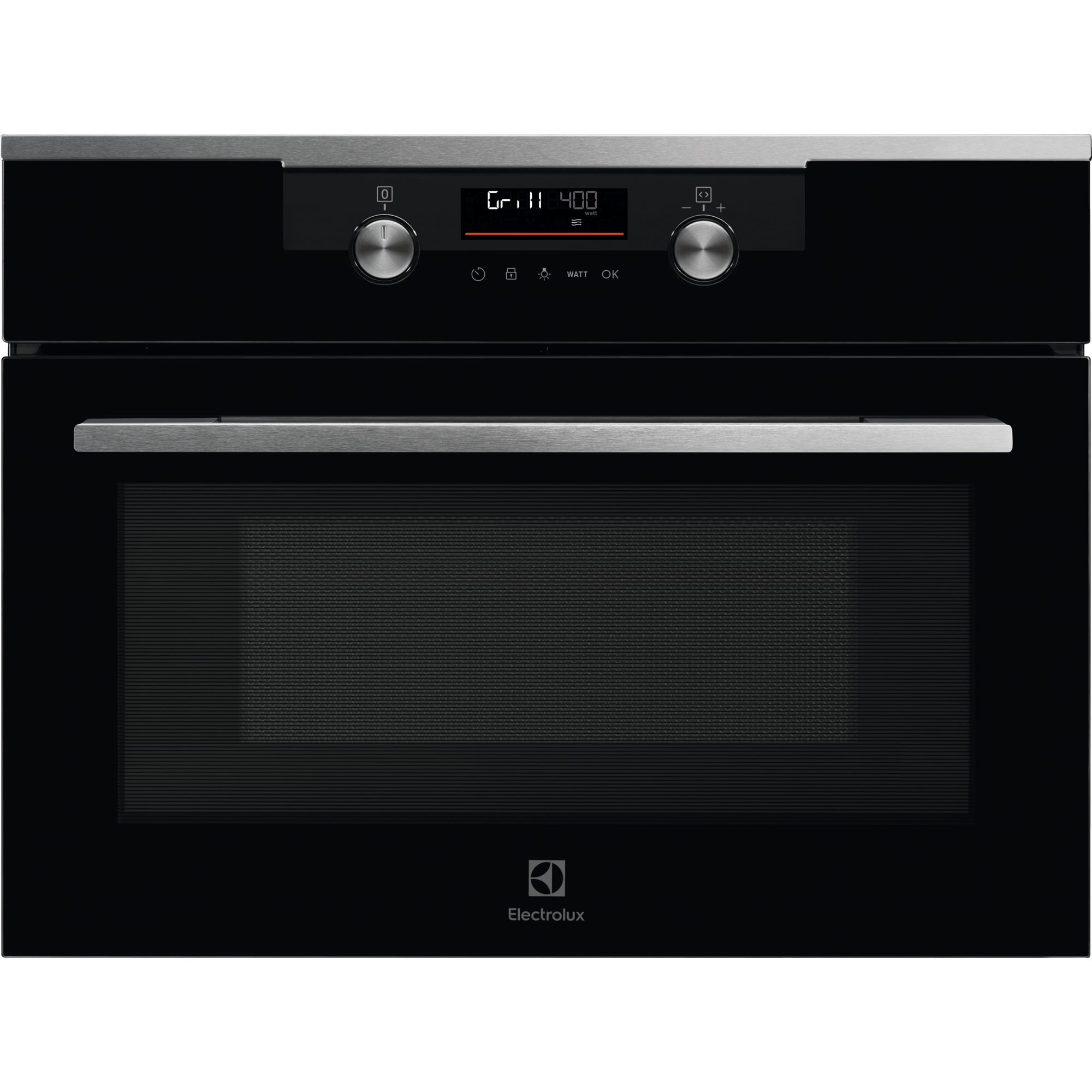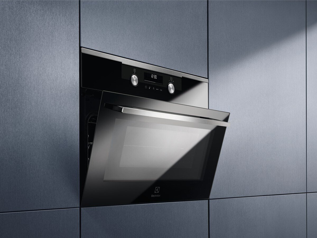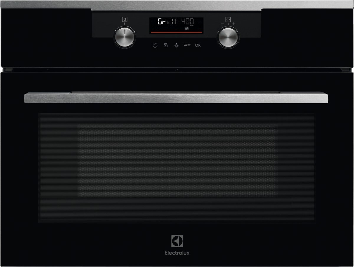 Electrolux KVMDE46X Forno Microonde compatto Microonde 500. Dimensione del forno: Piccolo, Tipo di forno: Forno elettrico, Capacità interna forno totale: 42 L. Posizionamento dell’apparecchio: Da incasso, Colore del prodotto: Acciaio inox, Tipo di controllo: Manopola, Touch. Tipo di orologio: Elettronico. Carico di collegamento: 2100 W, Tensione di ingresso AC: 220-240 V, Frequenza di ingresso AC: 50 Hz. Quantità lampade: 1 lampada(e), Tipo di lampada: Alogena, Potenza lampadina: 25 W