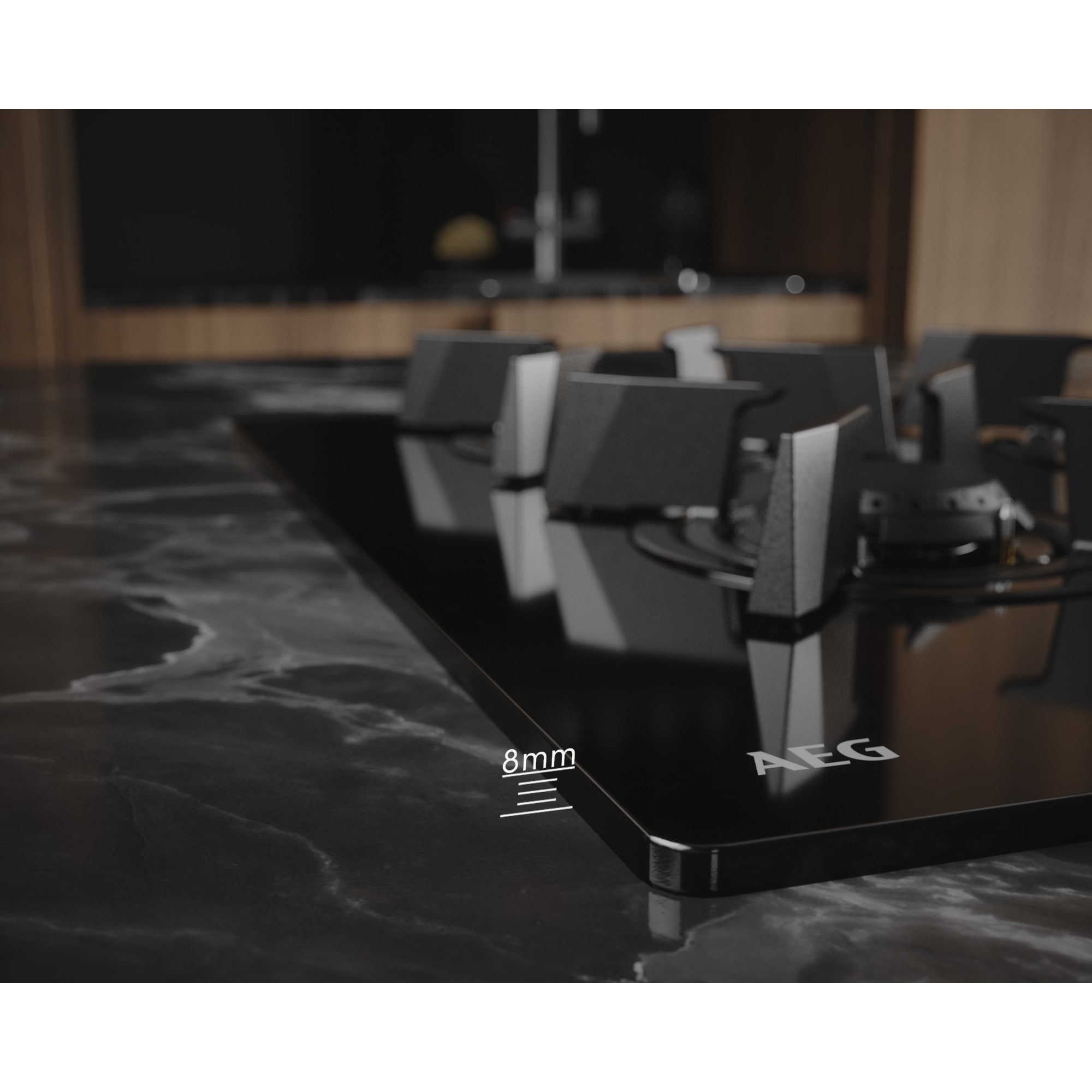 AEG HKB64453NB Piano cottura Gas on Glass Serie 8000 Flamelight 60 cm. Colore del prodotto: Nero, Posizionamento dell’apparecchio: Da incasso, Dimensione della larghezza del piano cottura: 75 cm. Certificazione: CE. Tipo di controllo: Manopola, Posizione di controllo: In alto a destra, Tipo di accensione elettronica: Accensione con manopola. Tensione di ingresso AC: 220-240 V, Frequenza di ingresso AC: 50/60 Hz, Tipo di gas: NG + GPL (Propano/Butano). Larghezza: 590 mm, Profondità: 520 mm, Altezza: 45 mm