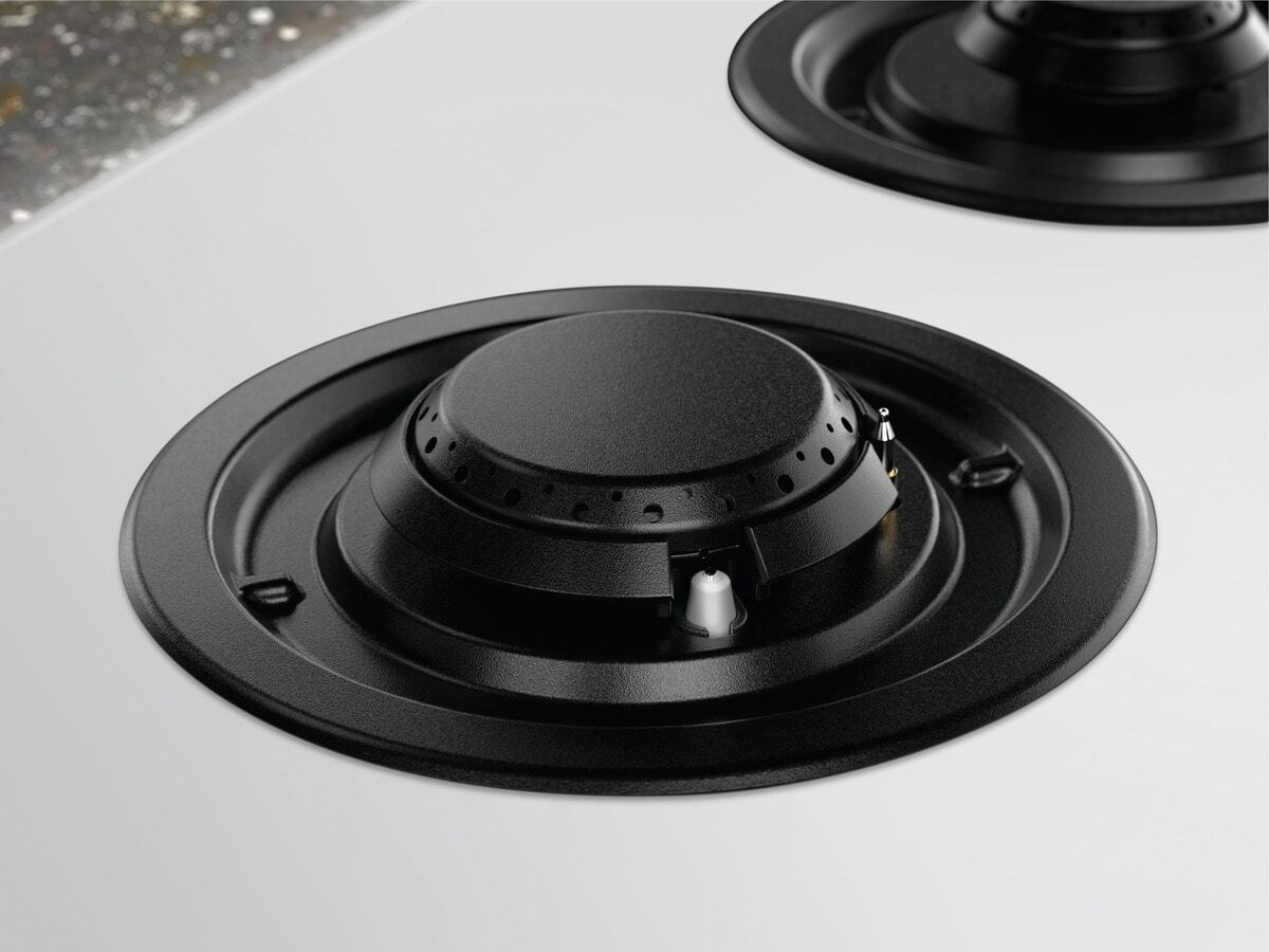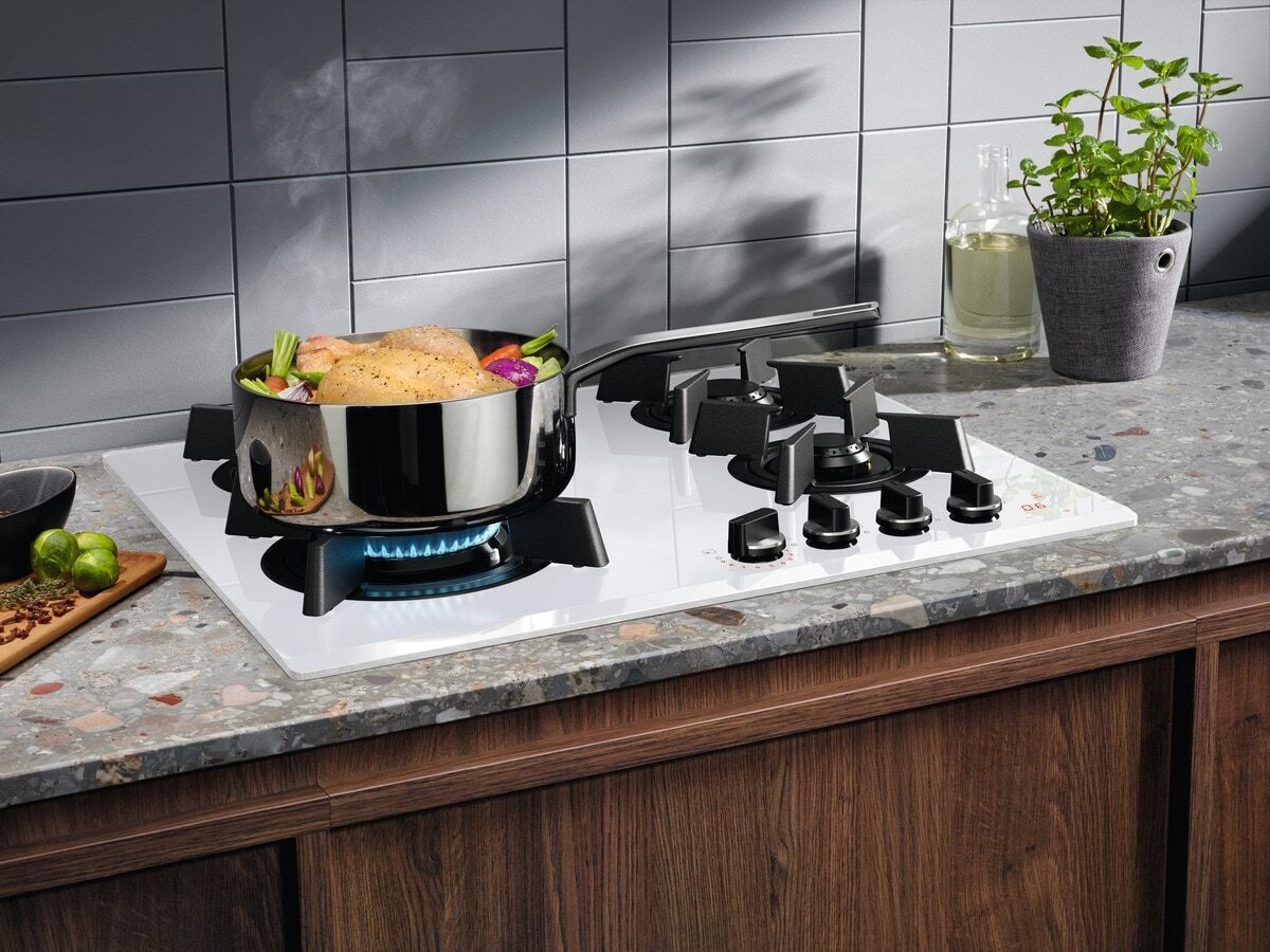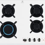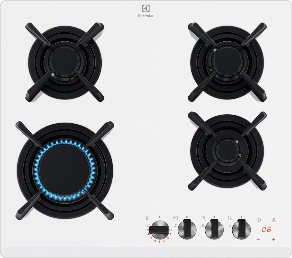 Electrolux KGG643753W Piano cottura Serie 800 Flamelight 60cm. Colore del prodotto: Bianco, Posizionamento dell’apparecchio: Da incasso, Dimensione della larghezza del piano cottura: 60 cm. Certificazione: CE. Tipo di controllo: Manopola, Posizione di controllo: Parte anteriore destra, Tipo di display: LED. Potenza aggregata (gas): 8500 W, Tensione di ingresso AC: 220-240 V, Frequenza di ingresso AC: 50/60 Hz. Larghezza: 590 mm, Profondità: 520 mm, Altezza: 8 mm