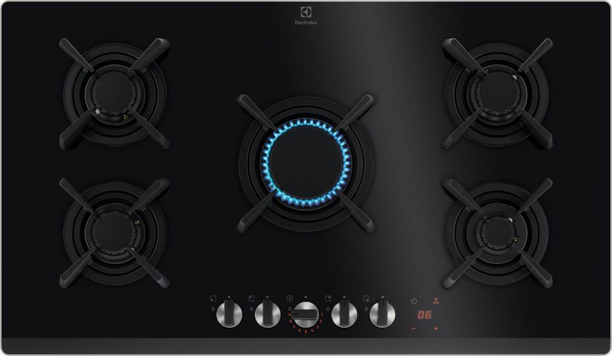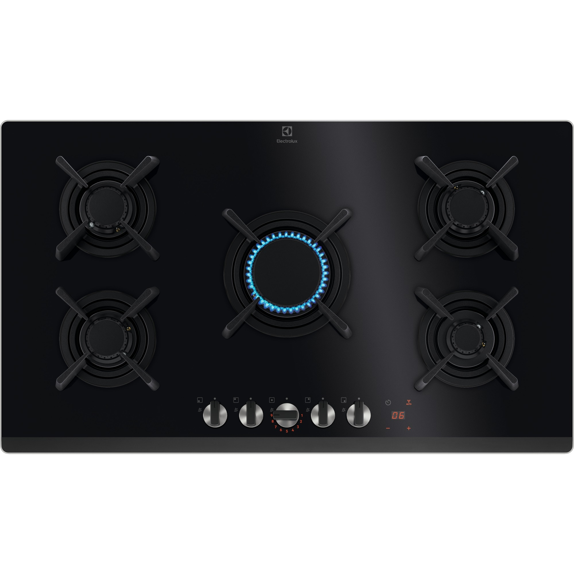 Electrolux KGG953753K Piano cottura Serie 800 Flamelight 90cm. Colore del prodotto: Nero, Posizionamento dell’apparecchio: Da incasso, Dimensione della larghezza del piano cottura: 90 cm. Certificazione: CE. Tipo di controllo: Manopola, Touch, Posizione di controllo: Frontale, Tipo di display: LED. Potenza aggregata (gas): 10350 W, Tensione di ingresso AC: 220-240 V, Frequenza di ingresso AC: 50/60 Hz. Larghezza: 880 mm, Profondità: 510 mm, Peso: 19,3 kg