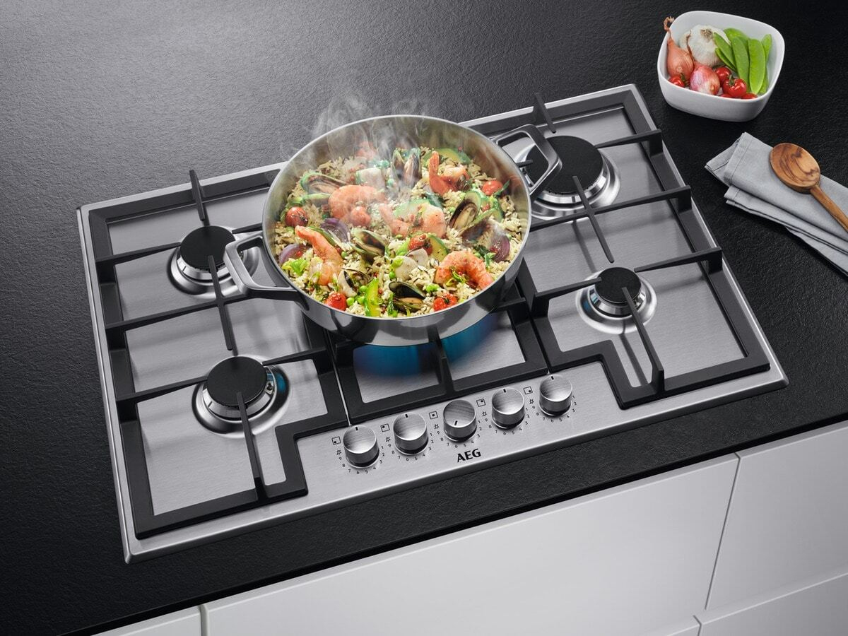 AEG HGB75420SM Piano cottura a gas Serie 6000 Slim Line 75 cm. Colore del prodotto: Acciaio inox, Posizionamento dell’apparecchio: Da incasso, Dimensione della larghezza del piano cottura: 75 cm. Certificazione: UL. Tipo di controllo: Manopola, Posizione di controllo: Frontale superiore, Tipo di accensione elettronica: Accensione con manopola. Tensione di ingresso AC: 220-240 V, Frequenza di ingresso AC: 50/60 Hz, Tipo di gas: NG + GPL (Propano/Butano). Larghezza: 745 mm, Profondità: 510 mm, Peso: 13,5 kg