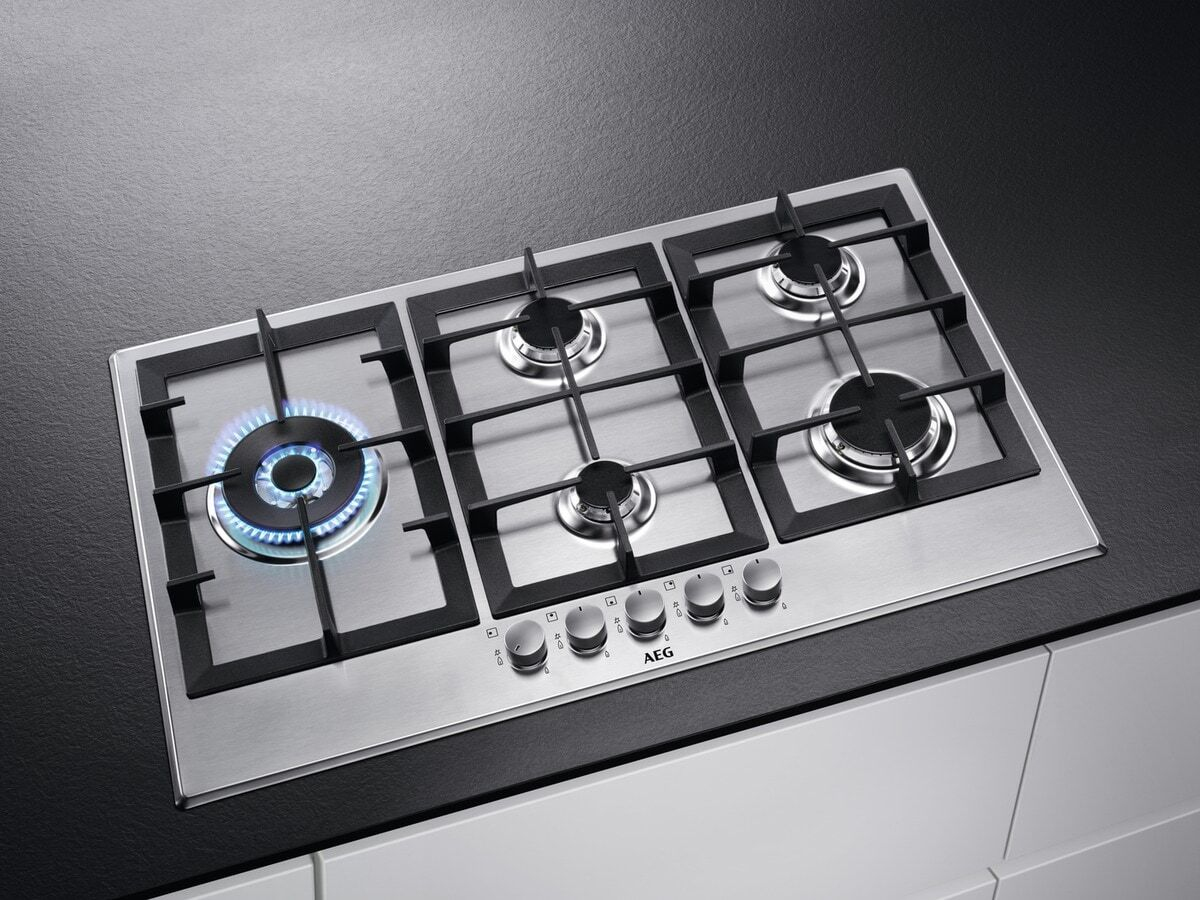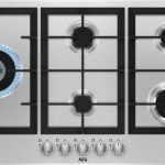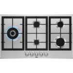 AEG HGB95522SM Piano cottura a gas Serie 6000 Slim Line 90 cm. Colore del prodotto: Acciaio inox, Posizionamento dell’apparecchio: Da incasso, Dimensione della larghezza del piano cottura: 90 cm. Certificazione: CE. Tipo di controllo: Manopola, Posizione di controllo: Frontale, Tipo di accensione elettronica: Accensione con manopola. Potenza aggregata (gas): 830 W, Tensione di ingresso AC: 220-240 V, Frequenza di ingresso AC: 50/60 Hz. Larghezza: 857 mm, Profondità: 520 mm, Peso: 15,6 kg