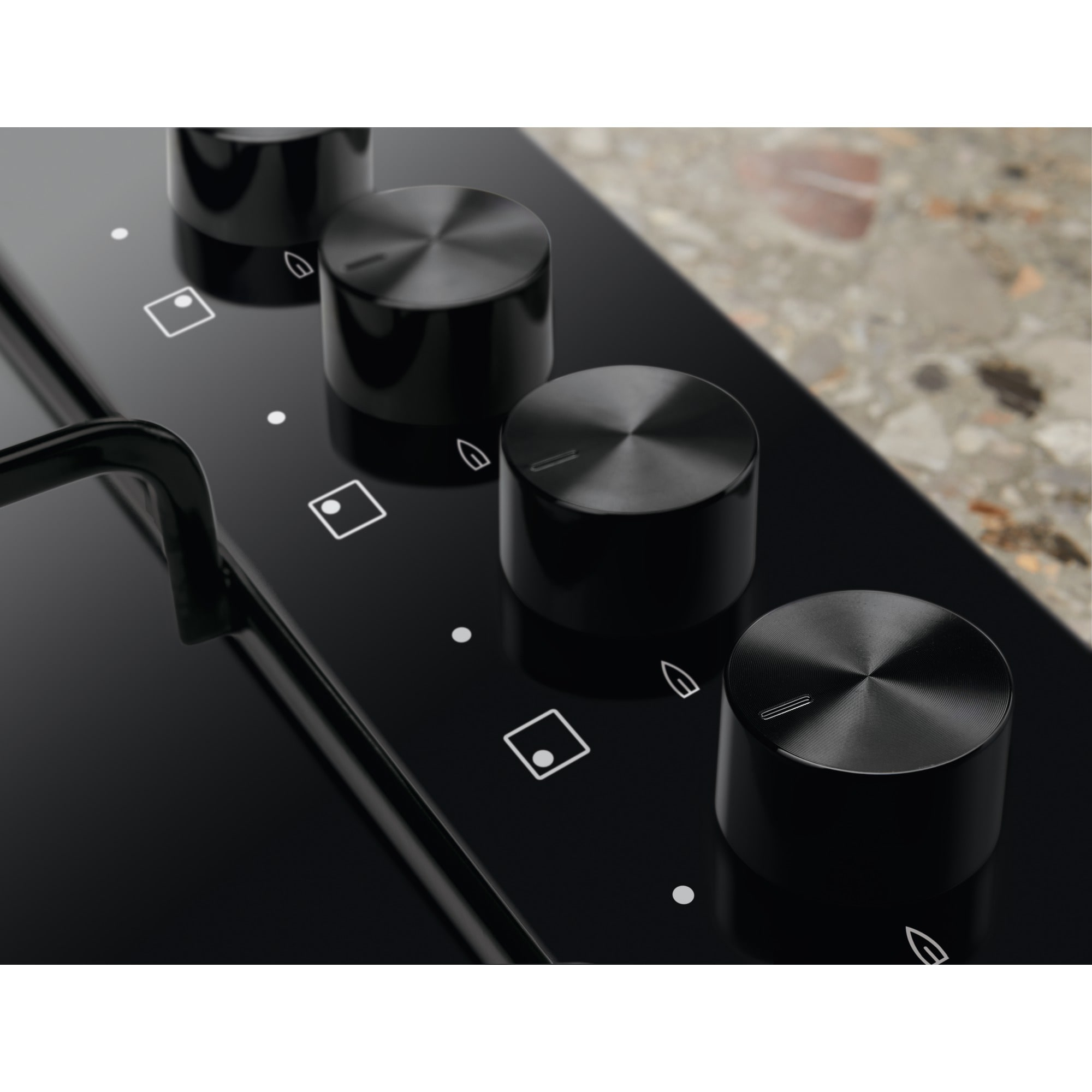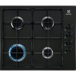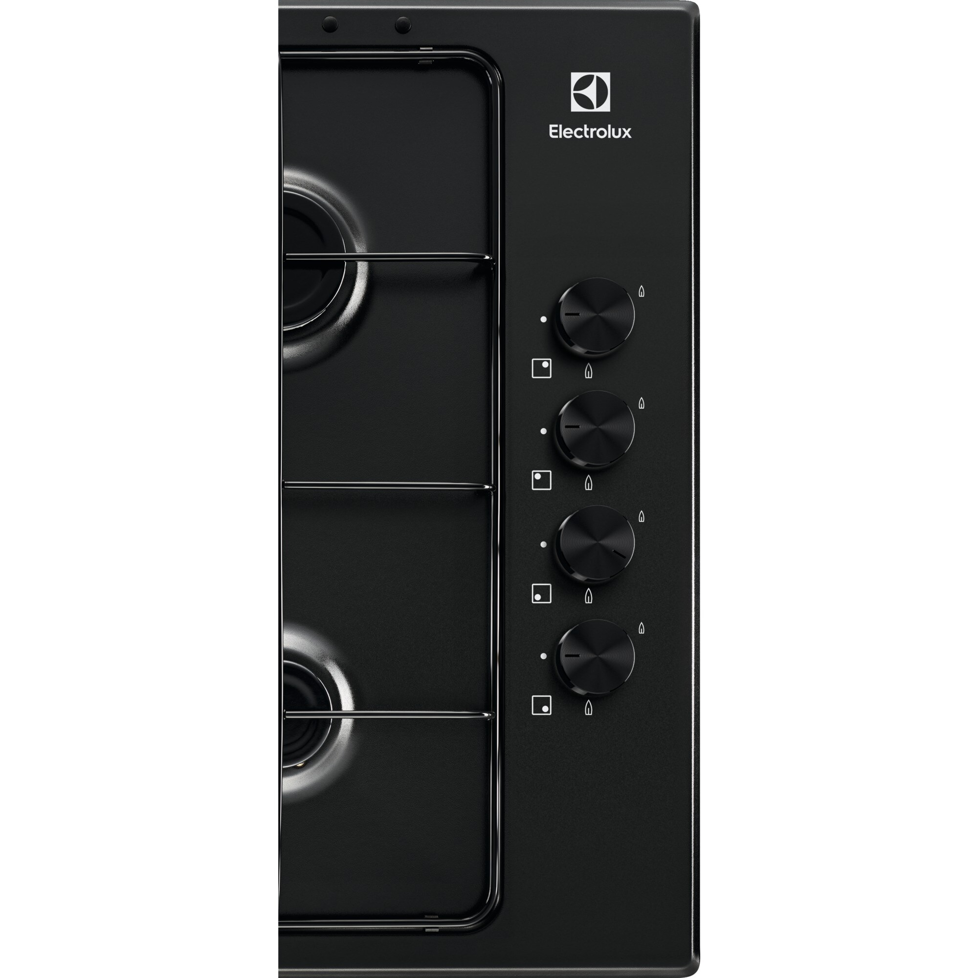 Electrolux KGS6404B Piano cottura a gas Serie 300 Slim side control 60cm. Colore del prodotto: Nero, Posizionamento dell’apparecchio: Da incasso, Dimensione della larghezza del piano cottura: 75 cm. Certificazione: CE. Tipo di controllo: Manopola, Posizione di controllo: In alto a destra, Tipo di accensione elettronica: Accensione con manopola. Tensione di ingresso AC: 220-240 V, Frequenza di ingresso AC: 50/60 Hz, Tipo di gas: NG + GPL (Propano/Butano). Larghezza: 594 mm, Profondità: 510 mm, Peso: 7,2 kg