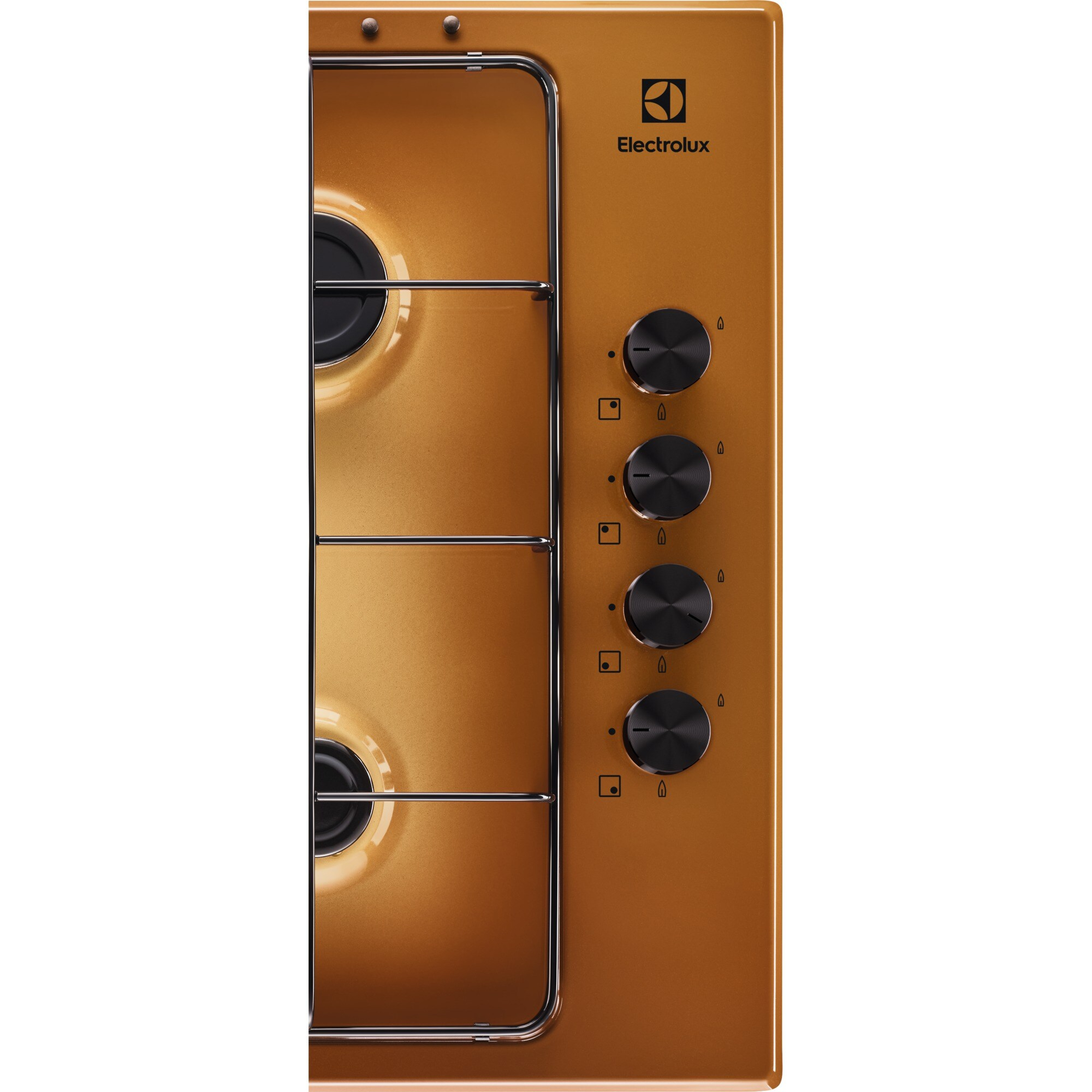Electrolux KGS6404T Piano cottura a gas Serie 300 Slim side control 60cm. Colore del prodotto: Marrone, Posizionamento dell’apparecchio: Da incasso, Dimensione della larghezza del piano cottura: 75 cm. Certificazione: CE. Tipo di controllo: Manopola, Posizione di controllo: In alto a destra, Tipo di accensione elettronica: Accensione con manopola. Tensione di ingresso AC: 220-240 V, Frequenza di ingresso AC: 50/60 Hz, Tipo di gas: NG + GPL (Propano/Butano). Larghezza: 594 mm, Profondità: 510 mm, Peso: 7,4 kg