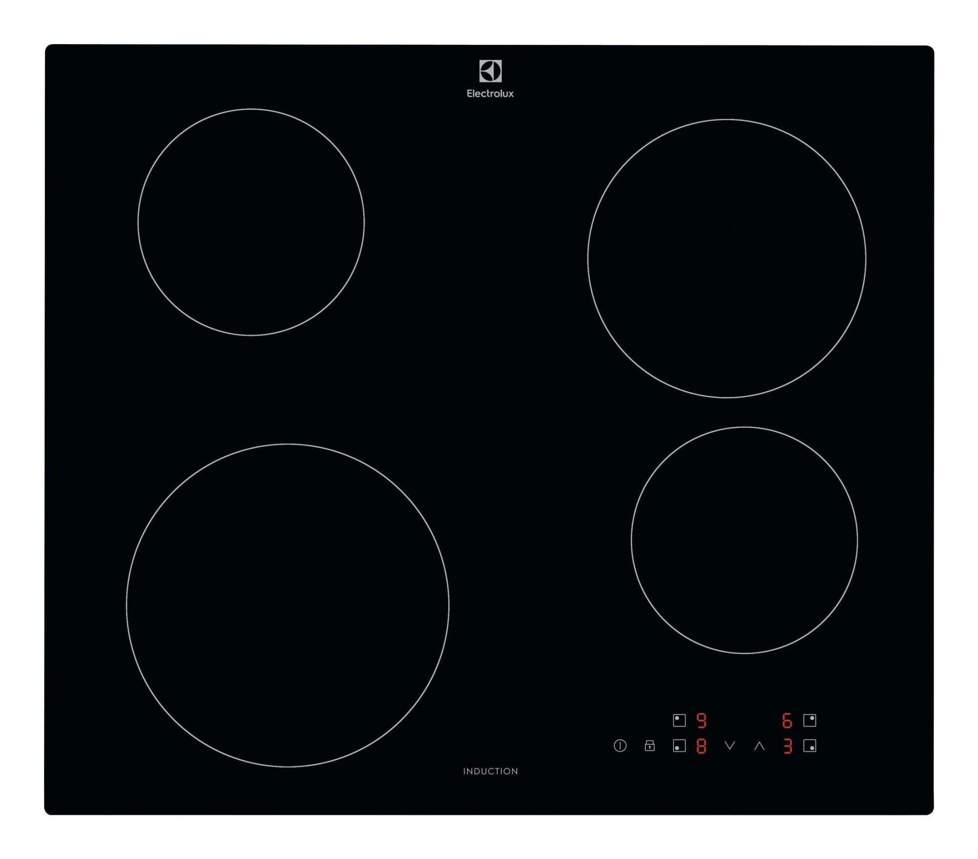 Electrolux Serie 300 KIB60424CK Piano cottura ad induzione 60cm. Colore del prodotto: Nero, Posizionamento dell’apparecchio: Da incasso, Dimensione della larghezza del piano cottura: 75 cm. Certificazione: DEMKO|CE|UL. Tipo di controllo: Touch, Posizione di controllo: Parte anteriore destra, Tipo di display: LED. Potenza aggregata (elettrica): 3000 W, Tensione di ingresso AC: 220-240 V, Frequenza di ingresso AC: 50/60 Hz. Larghezza: 590 mm, Profondità: 520 mm, Peso: 8,6 kg