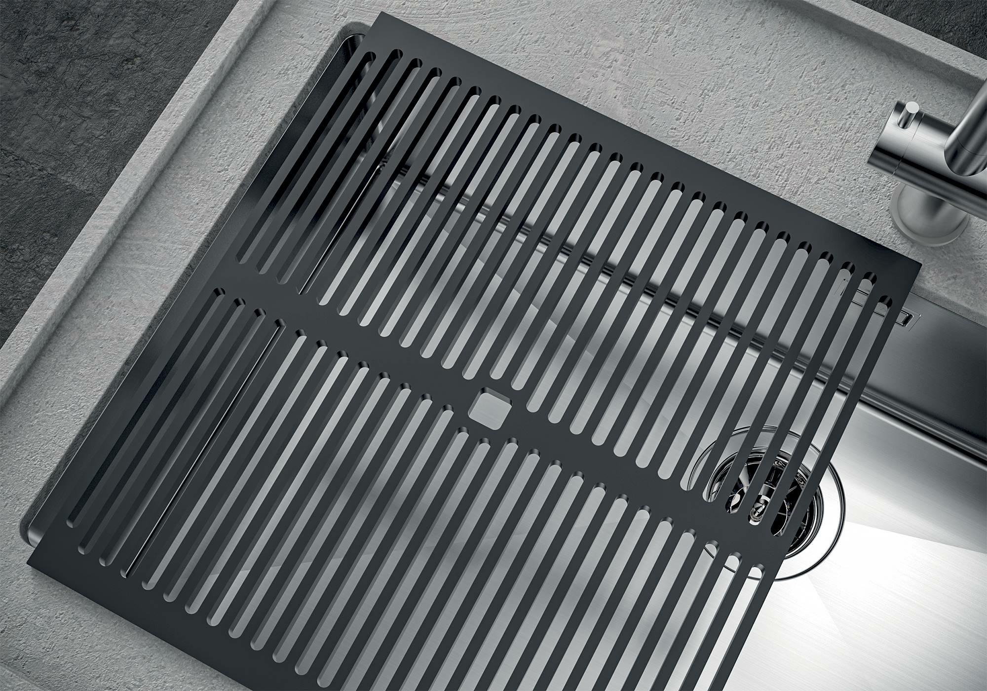 Il troppo/pieno è una sicurezza sempre presente sui lavelli Foster che impedisce il traboccare dell’acqua dalla vasca in caso di dimenticanze. La soluzione a scarico perimetrale migliora l’estetica grazie alla forma squadrata ed essenziale.